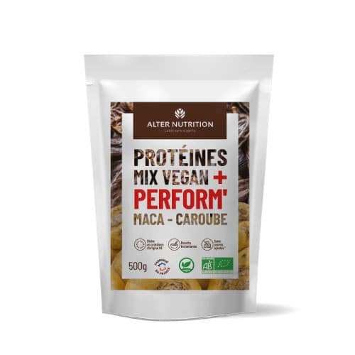 Savoureuses et riches en bienfaits nutritionnels, nos protéines mix vegan bio perform’ viendront agrémenter vos recettes et vos boissons préférées. Au quotidien, elles vous aideront à maintenir une excellente force musculaire et compléter vos apports en protéines. Un shaker de notre recette mix vegan bio perform’ maca – caroube après votre entrainement sportif et hop, le tour est joué ! Découvrez également notre whey vegan.